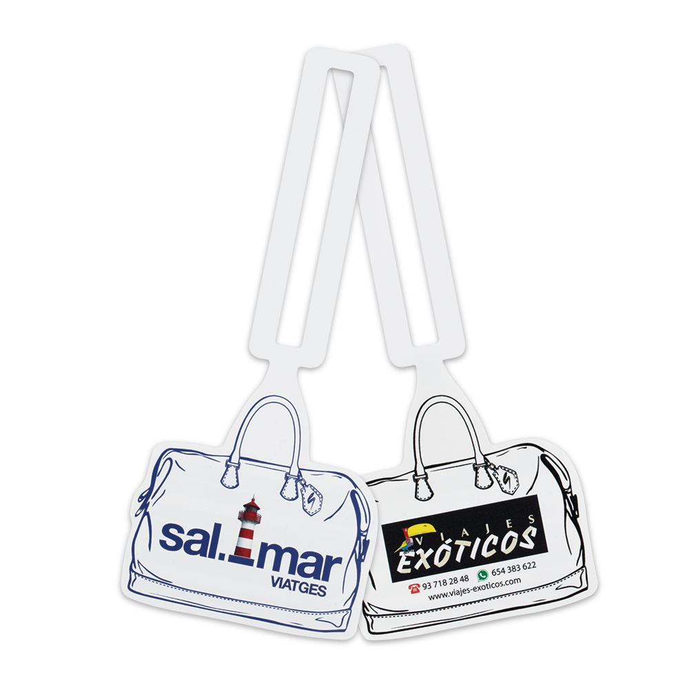 Étiquette de bagages personnalisable pour tous vos bagages. Obligatoire pour le check in de vos voyages. Fabriquée en PP. Parfaitement imperméable.impression de votre logo avec toutes ses couleurs. Idéale pour que vos bagages soit sécurisés et éviter qu’ils s’égarent. Etiquette en forme de sac de voyage pour les informations nécessaires pour check in.
